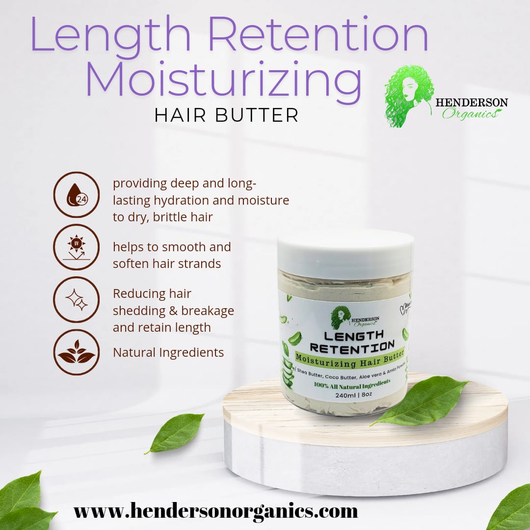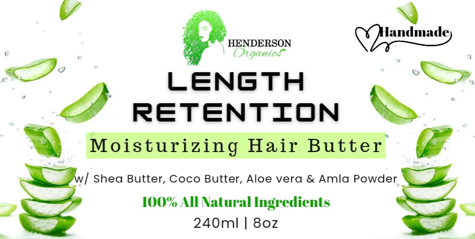 Our Length Retention Moisturizing Hair Butter is a handmade product that produced with 100% all-natural ingredients for all hair types. This amazing product provides intense moisture to the hair especially dry damaged hair, by acting as a sealant to lock in hydration, reducing frizz, breakage and improving manageability while adding shine and softness.